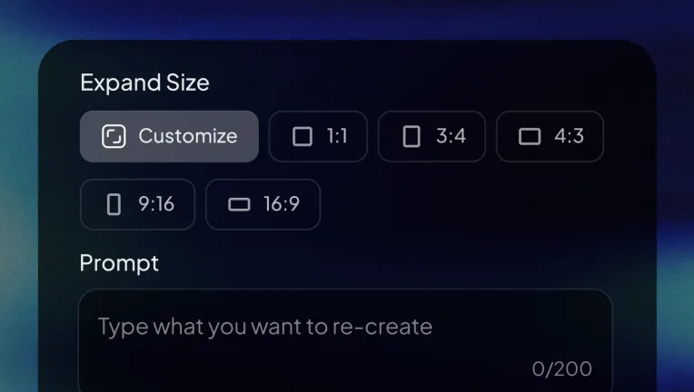 Choose a regular or custom output size, or enter a prompt to refine the expansion.